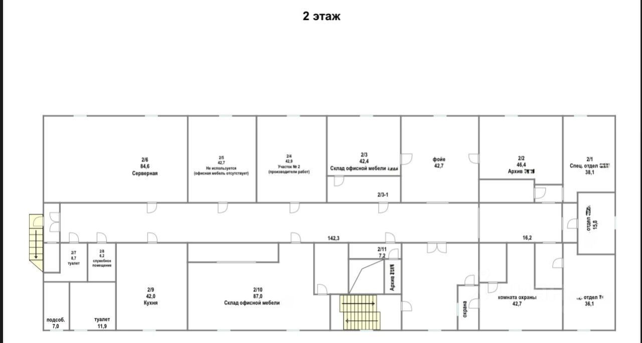 На участке одно здание 3 этажа, площадью 2403 квм ( поэтажный план в разделе фото).