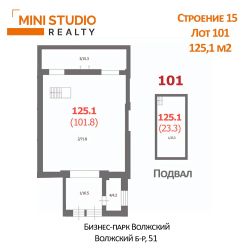 В площадь 125,1 кв.м. входит первый этаж (101,8кв.м) и подвальное помещение (23,3). Патио (примерно 60 кв.м) и разборная антресоль (примерно 40 кв.м) являются приятным бонусом к приобретаемому помещению.