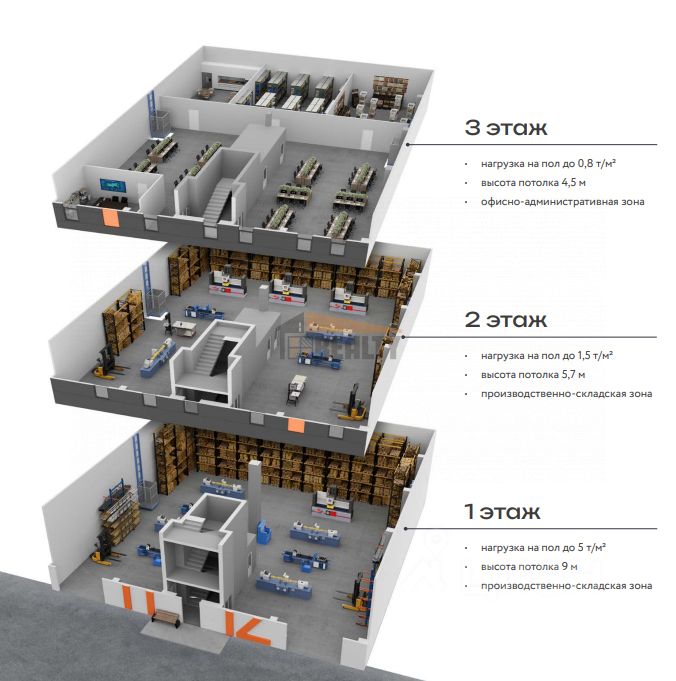 Первый и второй этажи подойдут под размещения производств и склада, третий этаж под размещение офисного блока (шоурума, офиса продаж, конструкторского бюро и т.п.). Юнит обеспечен восемью грузовыми лифтами-подъемниками грузоподъемностью 2 т. Имеются подъемно-секционные ворота на нулевом уровне в зоне разгрузки. Отдельный вход для сотрудников. Выделенная электрическая мощность для данного юнита составляет - 345 кВт с возможностью увеличения (условия обсуждаются дополнительно).