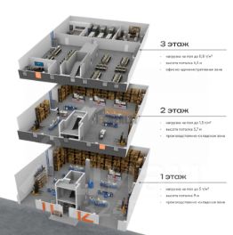 Первый и второй этажи подойдут под размещения производств и склада, третий этаж под размещение офисного блока (шоурума, офиса продаж, конструкторского бюро и т.п.). Помещение обеспечено грузовыми лифтами-подъемниками грузоподъемностью 2 т. Имеются подъемно-секционные ворота на нулевом уровне в зоне разгрузки. Отдельный вход для сотрудников. Выделенная электрическая мощность для данного юнита составляет - 400 кВт с возможностью увеличения (условия обсуждаются дополнительно).