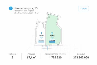 Продажа Street Retail помещения торгового или свободного назначения (ПСН) площадью 67,4 кв.м на 1-м этаже нежилого здания.