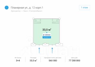 Продажа Street Retail помещения торгового назначения площадью 33,5 кв.м на 1 этаже жилого здания. Планировка — свободная, перекрытия — ж/б, высота потолков — 3,7 м.