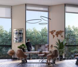 - На первых этажах офисных зданий просторные лобби с комфортной зоной ожидания, супермаркет, торговые помещения, отделения банков и сервисных служб, фитнес-студия