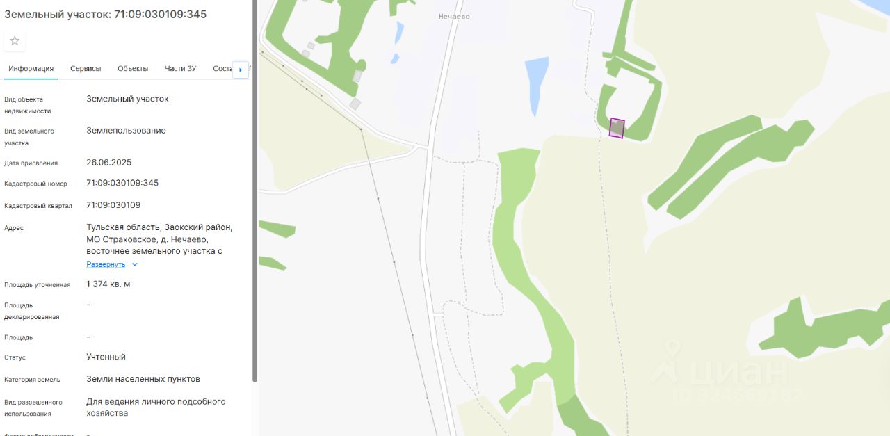 продажа земельного участка из земель населенных пунктов с кадастровым номером 71:09:030109:345, площадь 1374 кв. м, адрес: Тульская область, Заокский район, МО Страховское, д. Нечаево, восточнее земельного участка с кадастровым номером 71:09:030109:42, вид разрешенного использования: для ведения личного подсобного хозяйства