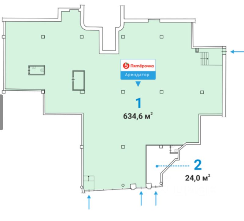 Продажа Street Retail помещения торгового или свободного назначения (ПСН) площадью 634,6 кв.м на 1 этаже жилого здания. Планировка — открытая (свободная), перекрытия — ж/б. Отлично подойдёт под любой вид деятельности: торговое помещение, магазин, ресторан, кафе, аптека, салон красоты, банк, офис продаж, кофейня и др.