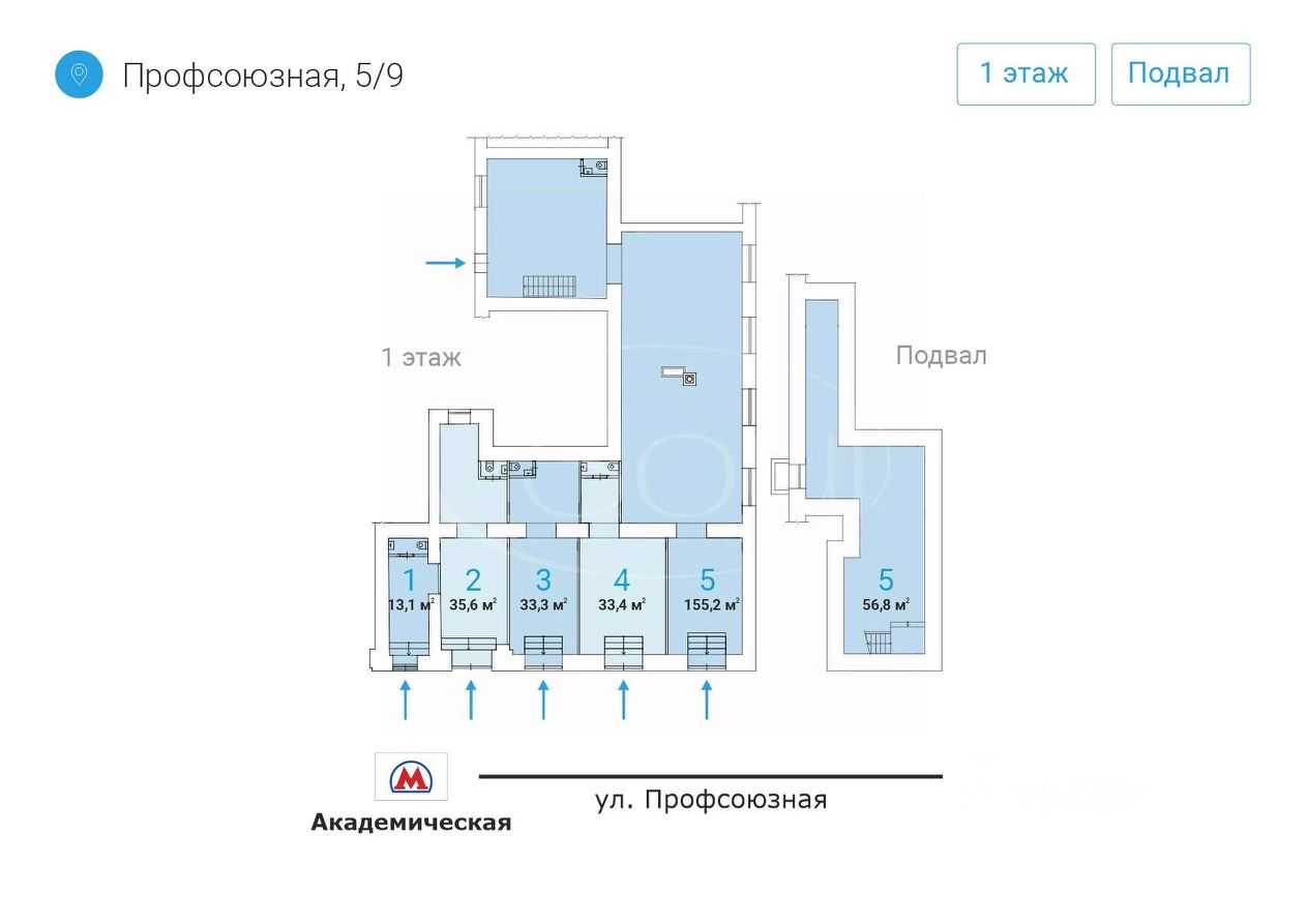1094787 Предлагаются к аренде и продаже стрит-ритейл помещения торгового и свободного назначения (ПСН), расположенные на улице Профсоюзная в Юго-Западном административном округе Москвы, в двух минутах пешком от станции метро "Академическая". Локация обладает отличной транспортной и пешеходной доступностью, что обеспечивает стабильный поток посетителей как за счёт жителей близлежащих домов, так и за счёт пассажиропотока метро и наземного транспорта.