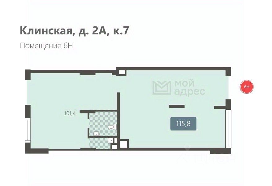 Коммерческое помещение площадью 115.8 м², расположено по адресу: г. Москва, Клинская улица, 2Ак7, помещение 6Н, район Ховрино. Объект занимает 1 этаж в здании с этажностью 32 этажа. Помещение без отделки, свободного назначения, имеет отдельный вход.
