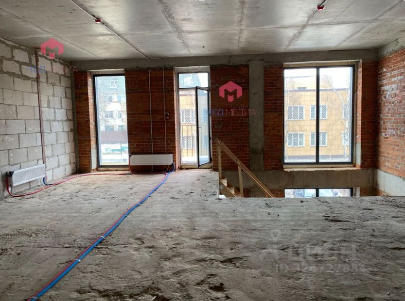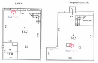 1 этаж 92,2 кв.м. (h=3.5м.), антресоль 86,3 кв.м. (h=3.2м). Есть небольшой балкон. В помещении выполнена стяжка.
