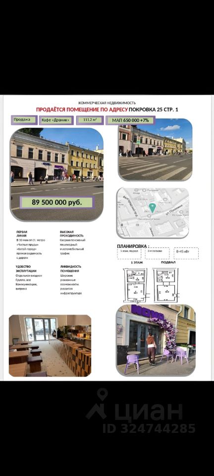 Продаётся арендный бизнес в центре Москвы. Улица Покровка дом двадцать пять, окупаемость 11.5 лет, первыя линия . Договор аренды подписан в 2025 году на 5 лет, арендная ставка-650000 р, индексация 7%.