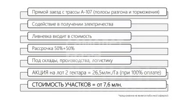 • Гибкие Площади под Ваши Задачи: от 20 соток (для малого производства/сервиса в охраняемой промзоне с КПП) до 20 Га (для крупных комплексов). Участки ровные, готовые к застройке.