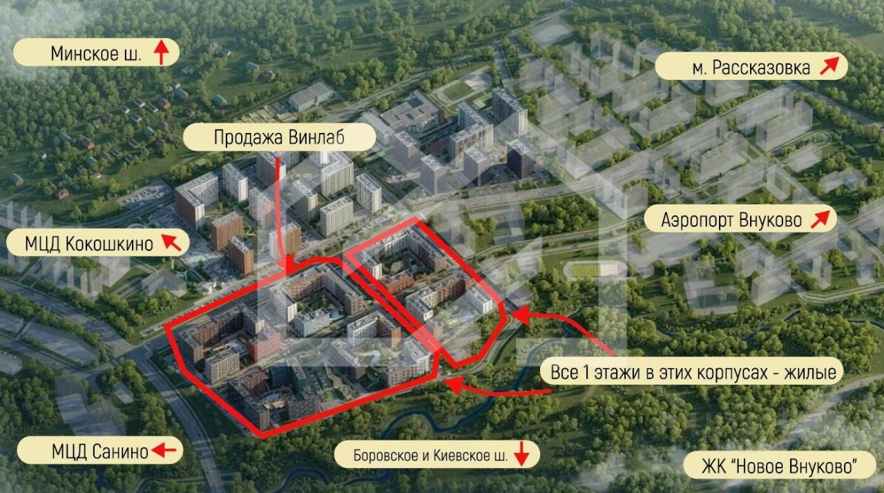 881709 . Предлагаем помещение свободного назначения формата street-retail с сетевым арендатором "ВинЛаб" в ЖК "Новое Внуково", корпус 23, площадью 111.7 кв. м, расположенное на первом этаже 9-этажного жилого дома. Без комиссии для покупателя.