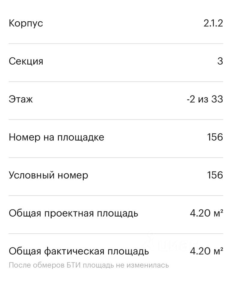 Кладовка площадью 4,20 м в ЖК Сигнальный 16, корпус 2.1.2, секция 3. Кладовка находится на -2 этаже, с удачным и удобным расположением.