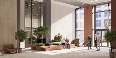 - На первых этажах офисных зданий просторные лобби с комфортной зоной ожидания, супермаркет, торговые помещения, отделения банков и сервисных служб, фитнес-студия