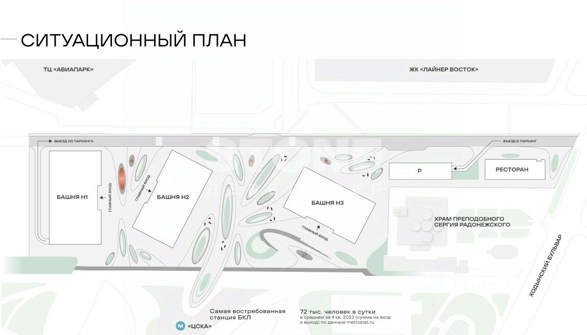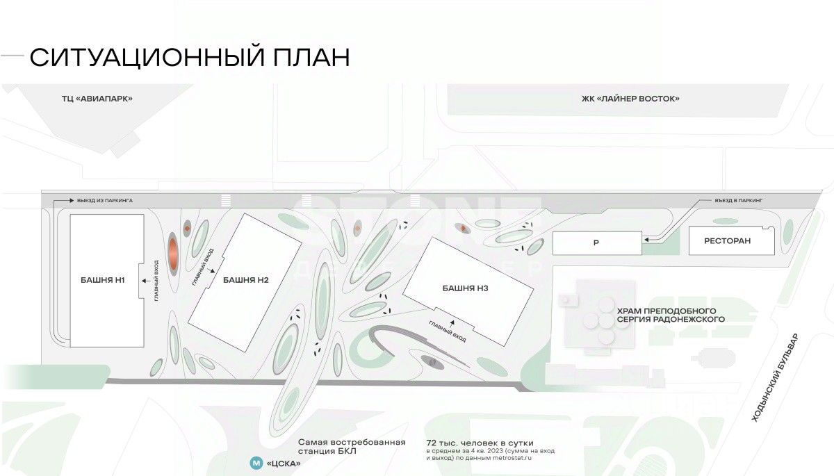 Расположение на первой линии Ходынского бульвара и витринное остекление в два уровня обеспечат превосходную просматриваемость здания изнутри. Целевая платежеспособная аудитория уже сформирована - она включает жителей ЖК бизнес- и премиум-класса ("Лайнер", "Гранд-Парк", "Прайм Парк" и др.), а также резидентов премиальных бизнес-центров, расположенных поблизости. Прямой выход к парку "Ходынское поле" привлечет гостей района, заинтересованных в качественном отдыхе.
