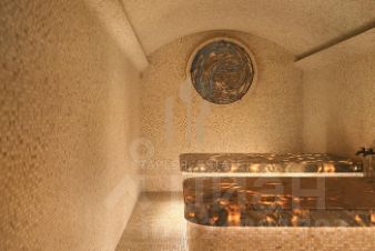 В комплексе спланированы: хамам, сауна, бассейн, купель, зал с большим столом, диваном и креслами и камином, комната отдыха, массажный кабинет, а также комната для курения.