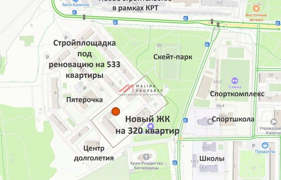 Помещение располагается на первой линии жилого комплекса, в центре жилого массива, рядом остановка общественного транспорта. Интенсивный автомобильный и пешеходный трафик вдоль помещения.