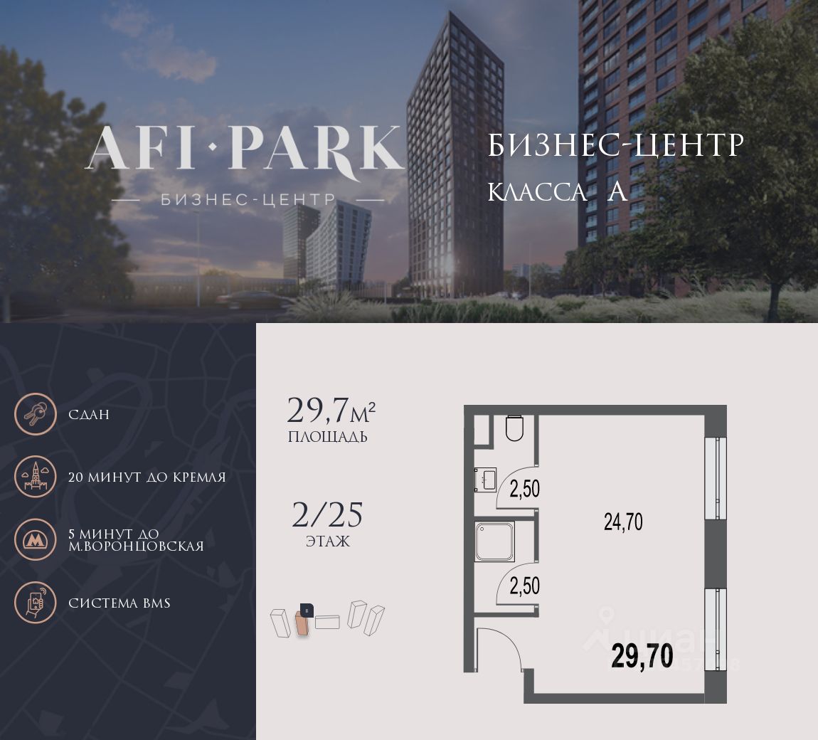 Продается просторное коммерческое помещение общей площадью 29,7 на 2 этаже в готовом бизнес-центре AFI Park. Строительство комплекса завершено.
