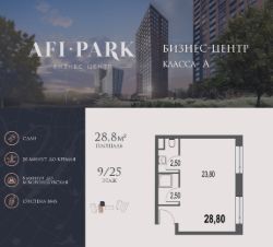 Продается просторное коммерческое помещение общей площадью 28,8 на 9 этаже в готовом бизнес-центре AFI Park. Строительство комплекса завершено.