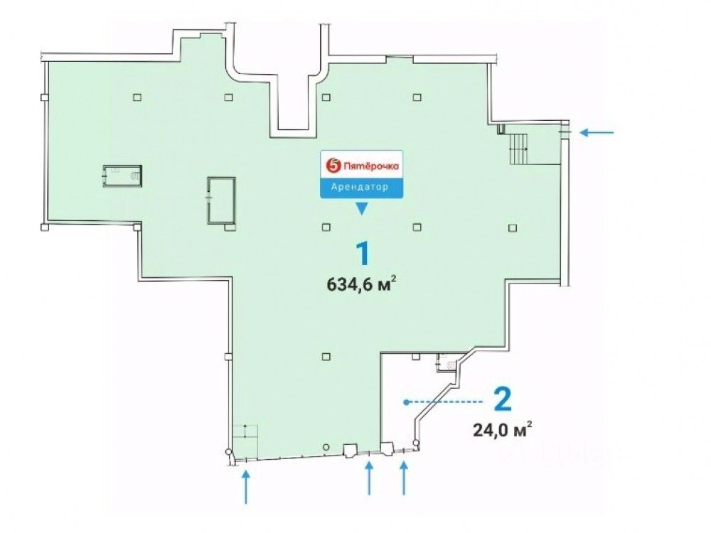 Продажа Street Retail помещения торгового или свободного назначения (ПСН) площадью 634,6 кв.м на 1 этаже жилого здания. Планировка — открытая (свободная), перекрытия — ж/б. Отлично подойдёт под любой вид деятельности: торговое помещение, магазин, ресторан, кафе, аптека, салон красоты, банк, офис продаж, кофейня и др.