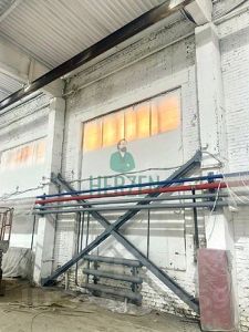 производственное помещение 4 размером 102,5 х 18 м, высота до ферм 8 м, крыша 11 м, установлены две кран-балки г/п 10т. Высота от пола до крюка 4,7 м