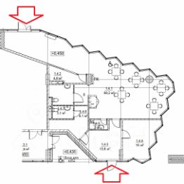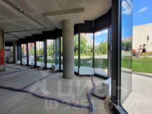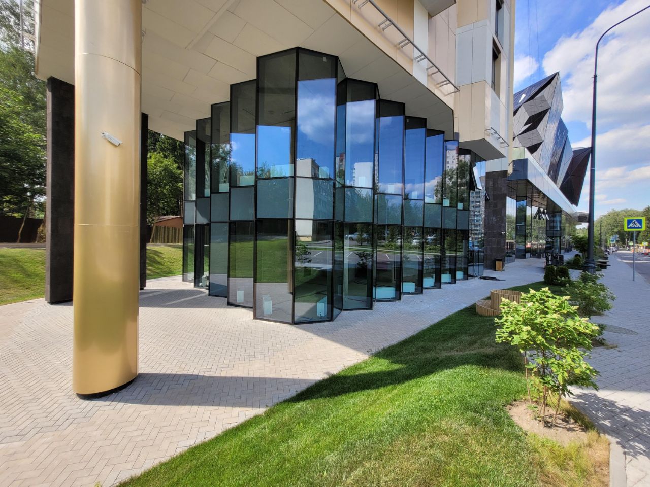 Помещение расположено на въезде в комплекс, в доме Юдашкина. Два отдельных входа, три санузла. Витринные окна на три стороны. Длина остекления по фасаду 48 м. Свободная планировка. Высокие потолки.