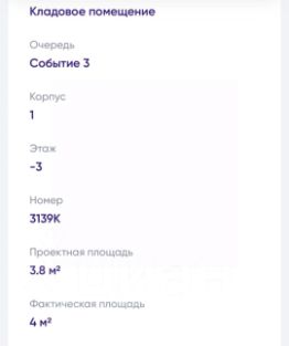 Продаётся кладовка в ЖК Событие-3. Общ площадь 4,3 м2. Расположена на -3 этаже, корпус 1, номер 3139К
