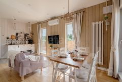 Планировка: кухня-гостиная, санузел, бойлерная, две спальни (две двухспальные кровати+ детская двухъярусная). Дом рассчитан на 8 спальных мест. Окна ПВХ.