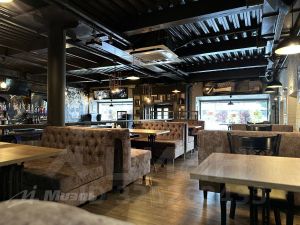 Уникальный дизайн интерьера гармонично вписан в бережно сохраненную кирпичную кладку 1917 года. Часть пространства украшена авторскими АРТ объектами талантливого художника авангардиста. Зал визуально разделен на три зоны. Гостевая посадка за столами на подиуме, зона контактного бара и вторая гостевая зона на подиуме. Есть возможность зонирования пространства дополнительными ширмами.