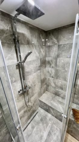 Большой санузел с душевой кабиной, предусмотрено место под стиральную машину.