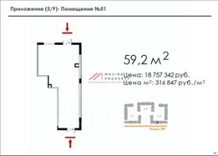 Помещение 59,2 м2, располагается на 1 этаже, открытая планировка. отдельный вход , высота потолка 4 м, витринные окна по фасаду. Электрическая мощность 0,2 к кВт/м2. Парковка перед фасадом. Место для размещения рекламы.