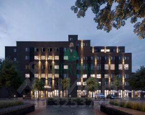 Фасад в стиле LOFT с декоративными элементами, красивая комплексная архитектурная подсветка зданий.