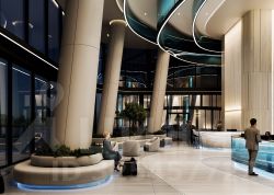Пространства лобби обладают двусветной структурой, площадью до 500 кв. м, высотой потолков 8 м и витражным остеклением, что обеспечивает высокую степень естественного освещения.