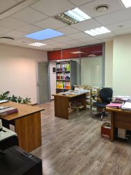 5 этаж (мансардный) общая площадь: 353.9 м2. Часть этажа. Помещение состоит из двух блоков с отдельными входами. ( 253. 2 м2 и 90.7 м2) В помещение несущих стен нет. Планировка смешанная: кабинет руководителя, переговорная, юр.отдел, бухгалтерия, кабинеты, кухня-столовая, с/узлы "М" и "Ж" на этаже. Высота потолка от 3 м. Мощность 17.36 кВА при напряжении 220/380 вольт. Стены выполнены из монолитного железобетона и кирпича, отделаны гипсокартоном, оклеены обоями с покраской. Внутренние перегородки между кабинетами - каркасные, выходящие в коридор из алюминиевого профиля со стеклом с жалюзи внутри. Окна в мансардной части "Велюкс" полы-ламинат, потолки подвесные "Армстронг"