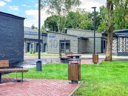 Отделка фасадов выполнена панелями с имитацией клинкерного кирпича. На территории организованы зоны отдыха, дополнительно имеется возможность для организации летних веранд и кафе.