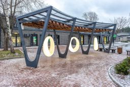 Отделка фасадов выполнена панелями с имитацией клинкерного кирпича. Дополнительно на территории организованы зоны отдыха, имеется возможность для организации летних веранд и кафе.