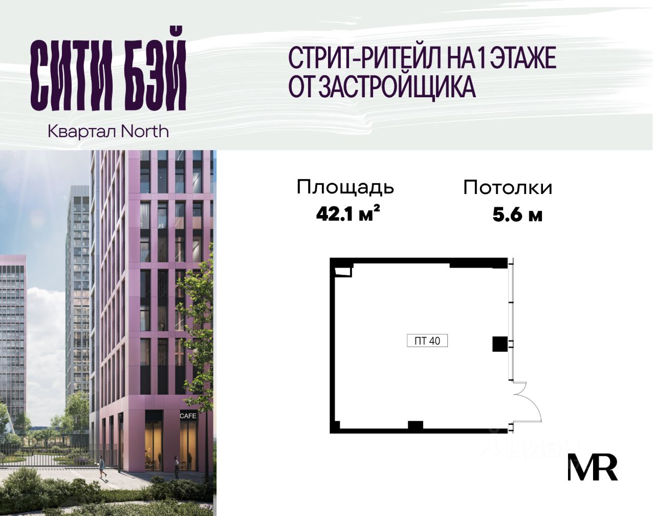 Продаётся коммерческое помещение свободного назначения с отдельным входом на 1 этаже жилого комплекса Сити Бэй от застройщика. Площадь помещения 42,1 м².