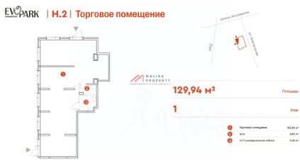 Помещение 129,94 м2, располагается на 1 этаже, открытая планировка, отдельный вход с фасада, высота потолка 4 м, витринные окна по фасаду. Электрическая мощность 0,2 Вт на м2. Парковка перед фасадом. Место для размещения рекламы.