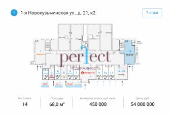 Предлагаем в продажу торговое помещение 68 м2 (1 этаж) на ул. 1-я Новокузьминская, д. 21к2, м. Рязанский проспект. Объект находится в 1-ой линии домов в жилом густонаселенном районе с высоким автомобильным и пешеходным трафиком, отличной транспортной доступностью.