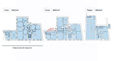 Здание общей площадью 703,4 м2, 1-й этаж 234,3 м2, 2-й этаж 265,5 м2, подвал 203,6 м2, смешанная планировка, отдельный вход с фасада, высота потолка 3-4,2 м, витринные окна по фасаду. Место для размещения рекламы.