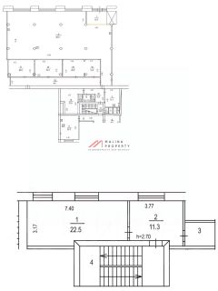 Помещение 678 м2, располагается на 1 этаже (2-й этаж 37 м2), смешанная планировка, отдельный вход с фасада и со двора, высота потолка 3 м, витринные окна по фасаду. Электрическая мощность 70 кВт. Парковка перед фасадом. Место для размещения рекламы.
