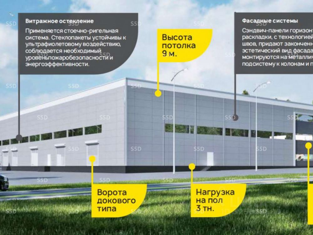 Ворота докового типа, нагрузка на пол: 3 тонны, наличие административно-бытового комплекса, фасадные системы, витражное остекление.Автономное отопления. Помещение без отделки. Количество парковочных мест: 30 м/м легковых и 20 м/м грузовых.