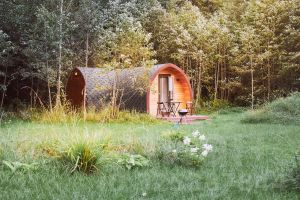 У каждого домика своя деревянная терраса, позволяющая разместить раскладные столики со стульями. В вечернее время вход и террасу освещают бра, а светодиодный дюралайт на наружных стенах каждого домика непрерывно освещает территорию глэмпинга в темное время суток.