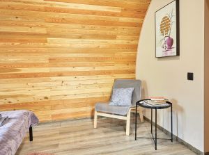 Для внутренней отделки каждого домика использована натуральная сибирская лиственница. Тепло в домиках обеспечивают инфракрасные регулируемые полы, а в зимнее время дополнительно устанавливаются электрические камины.