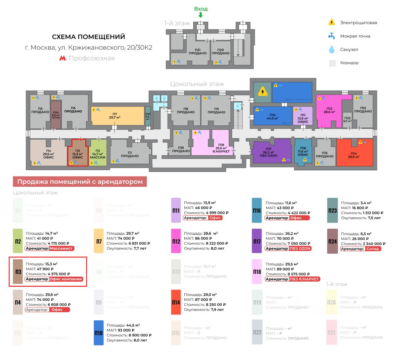 На планировке помещение П3 с арендатором (офис компании ООО "КонсСтрой") и мокрой точкой