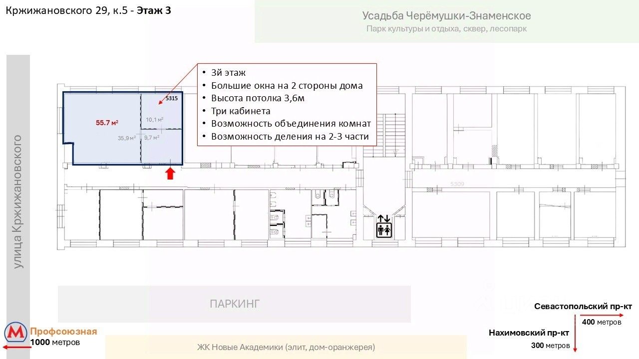 Близость к метро Профсоюзная, Академическая, Калужская - район с высокой деловой активностью.