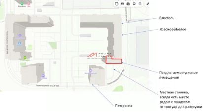 Помещение торцевое 194,2 м2, располагается на 1 этаже, открытая планировка, два отдельных входа, высота потолка 4 м, витринные окна по фасаду. Электрическая мощность 39 кВт (возможно увеличение до 45 кВт). Парковка перед фасадом. Место для размещения рекламы.