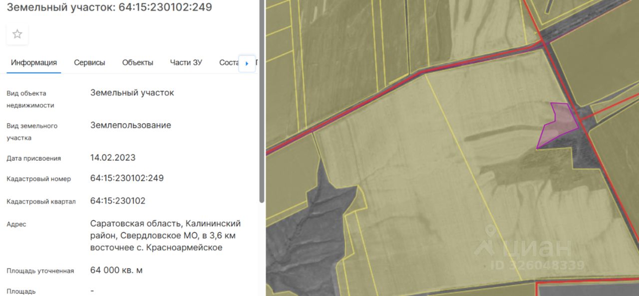 Земельный участок с кадастровым номером 64:15:230102:249, площадью 64 000 (шестьдесят четыре тысячи) кв.м, расположенного по адресу: Саратовская область, Калининский район, Свердловское МО, в 3,6 км восточнее с. Красноармейское, категория земель: земли сельскохозяйственного назначения, ограничения в использовании: нет разрешенное использование: сельскохозяйственное использование (растениеводство).