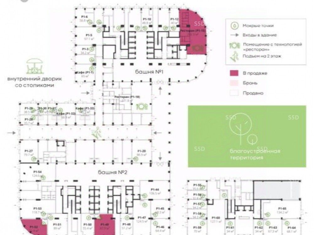 Общая площадь: 71,4 кв. м. (помещение Р1-52). 1 этаж (Ритейл). Отдельный вход с панорамным остеклением. Высота потолков: по запросу. Электрическая мощность: по запросу. Мокрая точка. Благоустроенная территория. Паркинг: открытый на 87 мест + подземный на 479 мест.