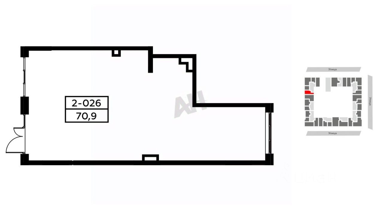 Помещение характеризуется следующими параметрами: площадь 70,9 кв. м, высота потолков 5,71 м, разрешенная мощность 14,18 кВт. Вентиляционная система представлена трубами диаметром 160 мм и 125 мм. Входы и этажи внутри помещения отсутствуют, витринное остекление не предусмотрено. Прогнозируемая проходимость составляет от 129 до 463 человек в час (данные предоставлены сервисом "Геоаналитика BestPlace").