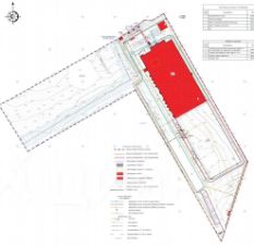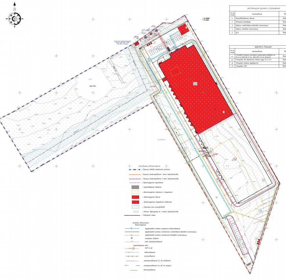1. На участке размещен незавершенный производственный корпус 13 000 кв. М. Производственно-складского комплекса кл. А. (Возведен фундамент и вертикальные конструкции 1-й очереди 7108 кв. М.).